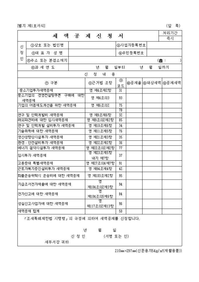 별지 1호서식은 세액 공제신청서로서 신청인의 신상명세와 신청내용을 기입합니다.
