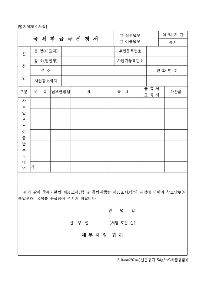 9,000원/월제20호서식은 국세환급금신청서로서 신청인의 신상명세와 착오납부내역을 기입합니다.