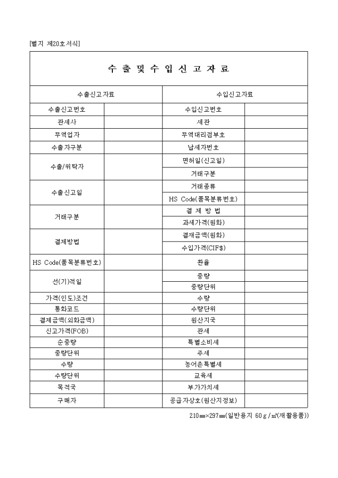 9,000원/월제20호서식은 수출 및 수입 신고 자료로서 수출내역과 수입내역을 기입합니다.