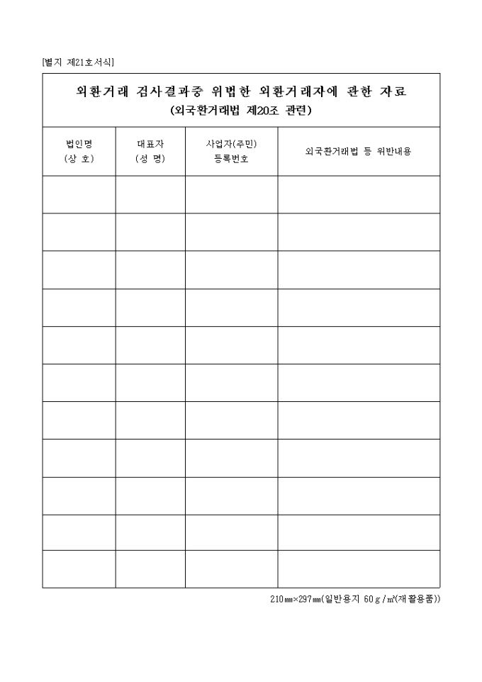 9,000원/월제21호서식으로 외환거래 검사 결과 중 위법한 외환 거래자에 관한 자료로서 법인명, 대표자, 주민등록번호, 외국환거래법 등 위반 내용을 기입합니다.