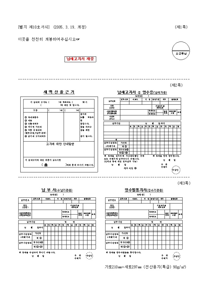 납세고지서겸영수증(납세자용).납부서(수납기관용.영수필통지서(징수기관용)(05.03.19.개정)(별지 제10호서식)