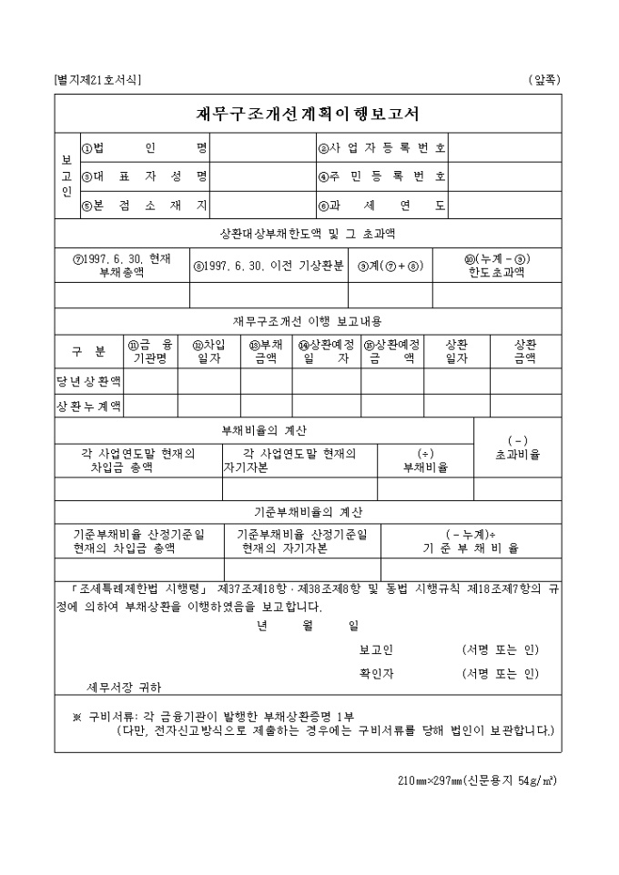제 21호서식은 재무구조개선 계획 이행 보고서로서 상환대상 부채한도액 및 그 초과액 내용과 재무구조개선 이행 보고내용을 기입합니다.