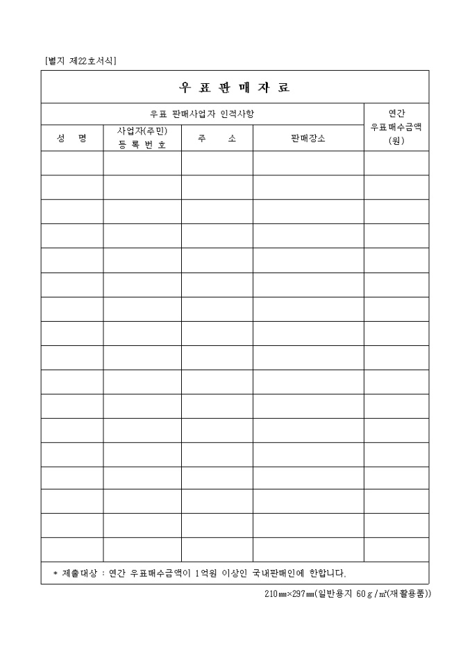 별지 제 22호서식은 우표판매 자료 서식으로 우표판매사업자의 인적사항을 기입합니다.