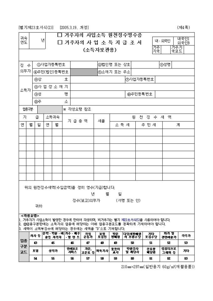 거주자의사업소득원천징수영수증(지급조서(05.3.19.개정)(별지 제23호서식(2)
