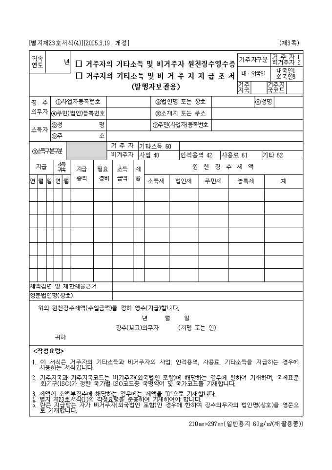 별지 제 23호서식은 거주자의 기타소득 지급영수증으로서 원천징수의무자 인적사항 및 지급내용 합계사항과 소득자 인적사항 및 연간 소득내용을 기입합니다.