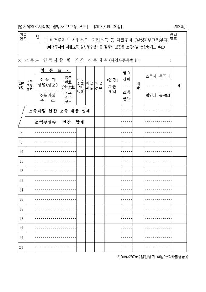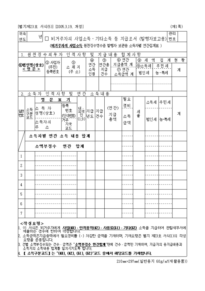 9,000원/월별지 제23호 서식은 비거주자의 사업소득.기타소득 등의 지급영수증으로서 원천징수의무자 인적사항 및 지급내용 합계사항과 소득자 인적사항 및 연간 소득내용을 기입합니다.