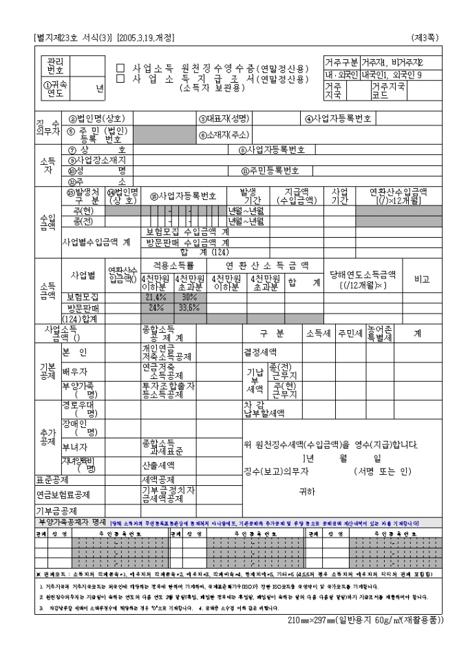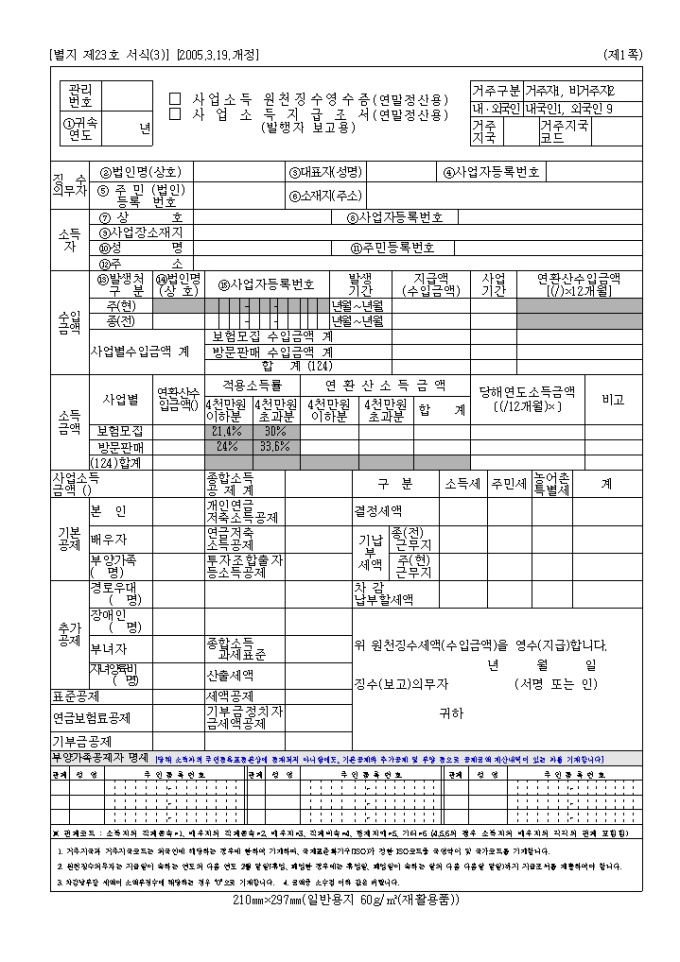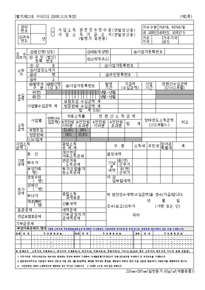 사업소득원천징수지급조서, 원천징수영수증(연말정산용)(05.3.19.개정(별지 제23호서식)
