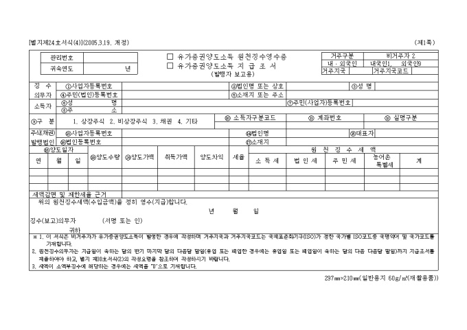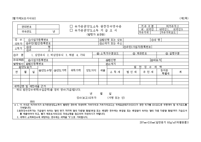 9,000원/월별지 제24호서식은 유가증권양도소득 원천 징수영수증, 유가증권양도소득지급조서로서 징수의무자, 소득자의 신상명세와 원천징수세액내역을 기입합니다.
