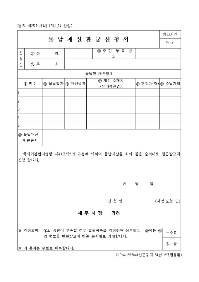 9,000원/월별지 25호서식은 물납재산 환급신청서로서 물납된 재산명세 내역과 신청인의 신상명세를 기입합니다.