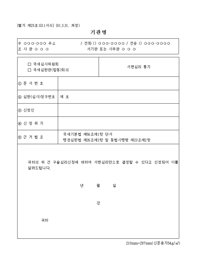 9,000원/월제25호의1서식은 국세시사위원회, 국세심판관 회의 서면심리 통지로서 구술심리신청에 대하여 서면심리만으로 결정할 수 있다고 인정되면 통지하는 서식입니다.