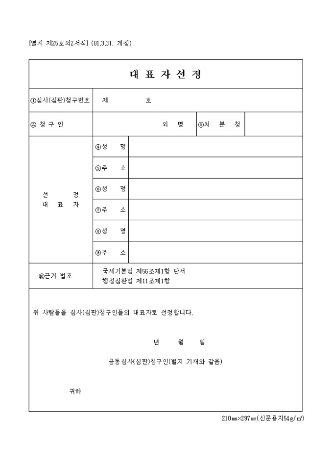 25호의2서식은 심사(심판)청구인들의 대표자로 선정하기 위한 서식입니다.