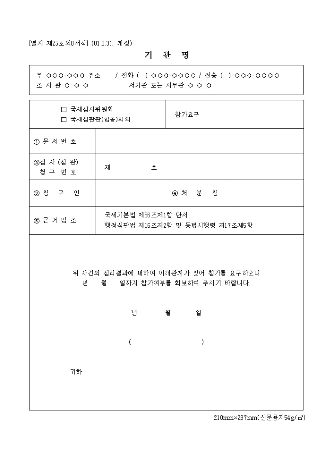 9,000원/월제25호의8서식은 국세심사위원회.국세심판관의 회의를 참가하길 희망하는 서식입니다.