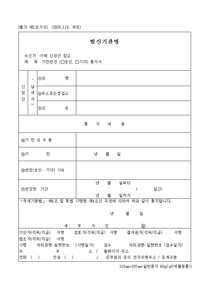 9,000원/월제2호서식은 납부기한연장, 승인, 기각서로서 신청인의 인적사항과 통지내용을 기입합니다.