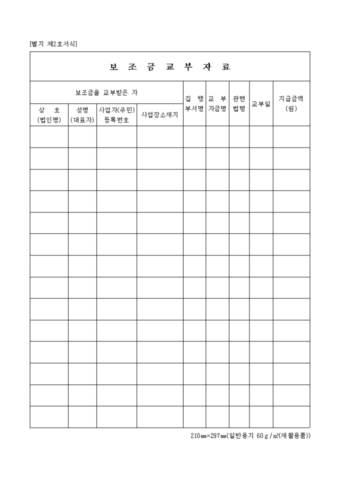 9,000원/월제2호서식은 보조금 교부 자료로서 보조금을 교부받은 자의 인적사항과, 집행부서명, 교부자금명, 관련법령 등을 기입합니다.