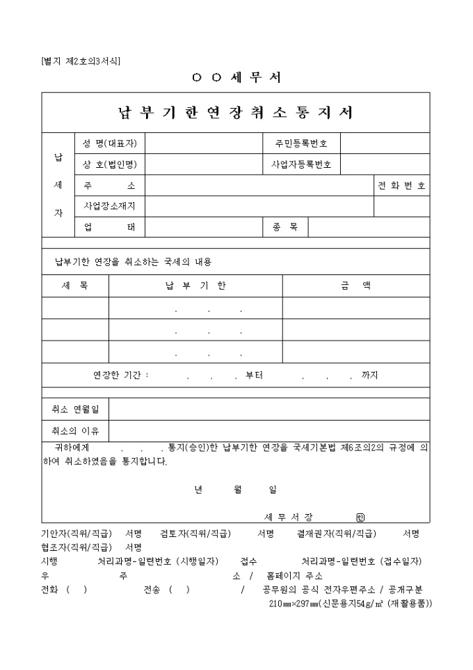 제2호의3서식은 납부기한의 연장을 취소하는 통지서로서 신청자의 인적사항과 통지 내용을 기입합니다.
