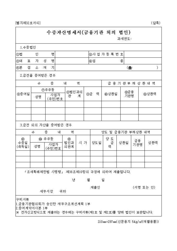 9,000원/월제32호서식은 수증자산명세서로서 수증법인, 금전을 증여받은 경우, 수증내역, 금융기관부채상환내역 등을 기입합니다.