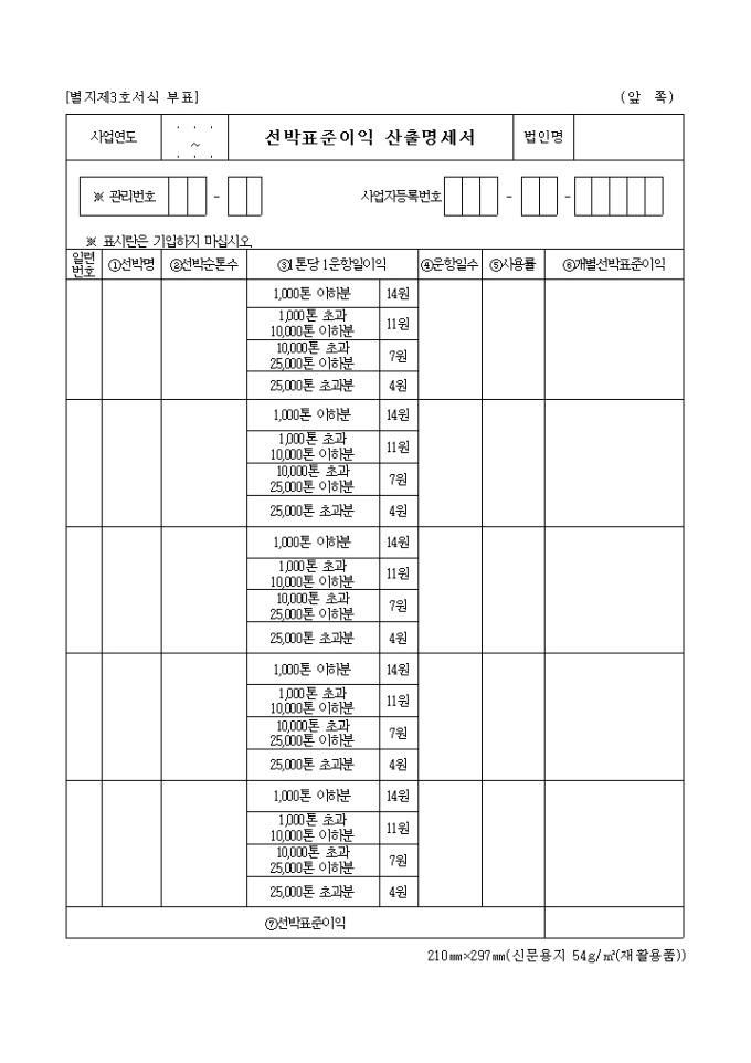 제3호서식은 선박 표준 이익 산출 명세서로서 선박명, 선박순통수, 운항일수, 사용률 등을 기입합니다.