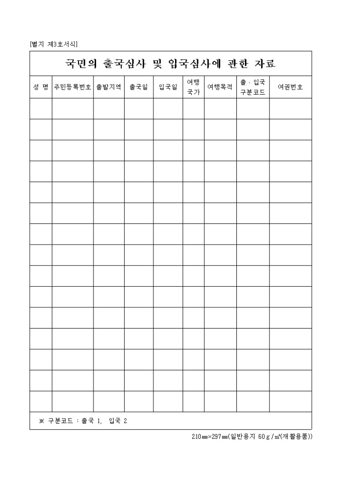 9,000원/월제3호서식은 국민의 출국 심사 및 입국 심사에 관한 자료로서 성명, 주민등록번호, 출발지역, 출국일, 입국일, 여행국가, 여행목적 등을 기입합니다.