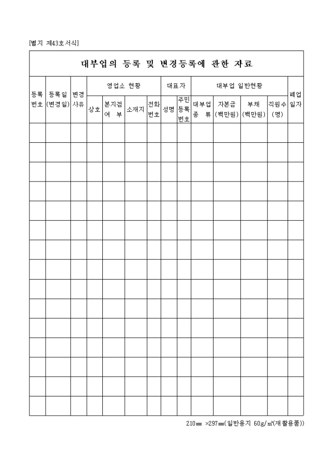 제43호 서식은 대부업의 등록 및 변경 등록에 관한 자료로서 영업소의 현황, 대부업 일반현황, 대표자의 인적사항 등을 기입합니다.