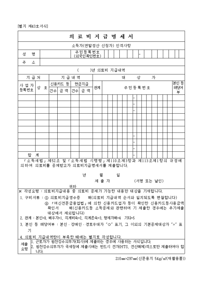9,000원/월제43호서식은 의료비 지급 명세서로서 소득자(연말정산 신청자) 인적사항과 의료비 지급 내역을 기입합니다.