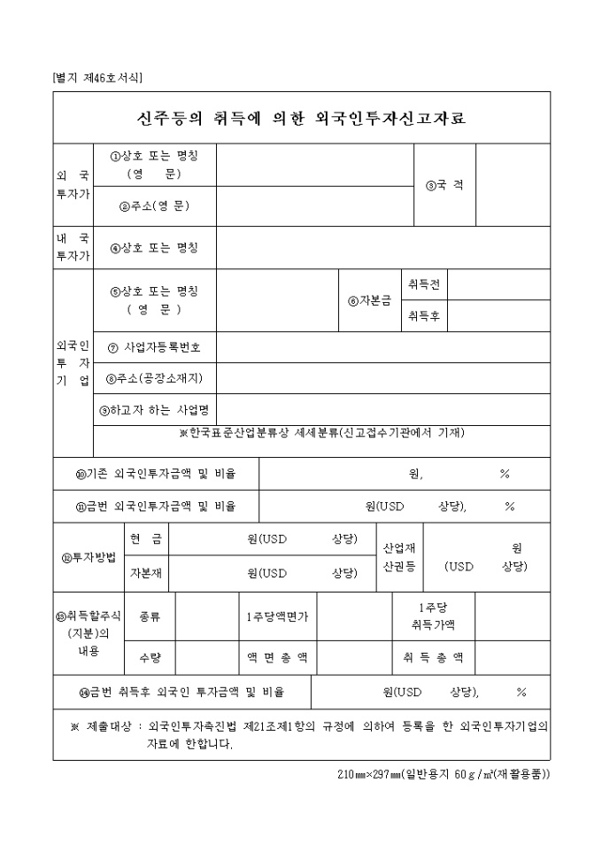 제46호서식은 신주 등의 취득에 의한 외국인 투자 신고자료로서 외국투자가 인적사항, 내국투자가 인적사항 등을 기입합니다.