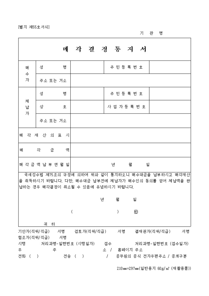 9,000원/월제55호서식은 매각결정 통지서로서 매수자와 체납자의 인적사항, 매각재산의 표시, 매각금액 등을 기입합니다.