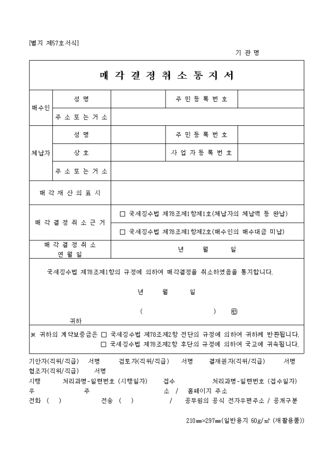 제57호서식은 매각결정취소 통지서로서 매수인과 체납자의 인적사항, 매각재산의 표시, 매각결정취소근거 등을 기입합니다.