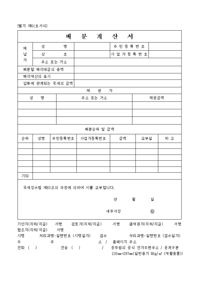 9,000원/월제61호서식은 배분 계산서로서 체납자의 인적사항, 배분할 매각대금의 총액, 매각재산의 표시 등을 기입합니다.