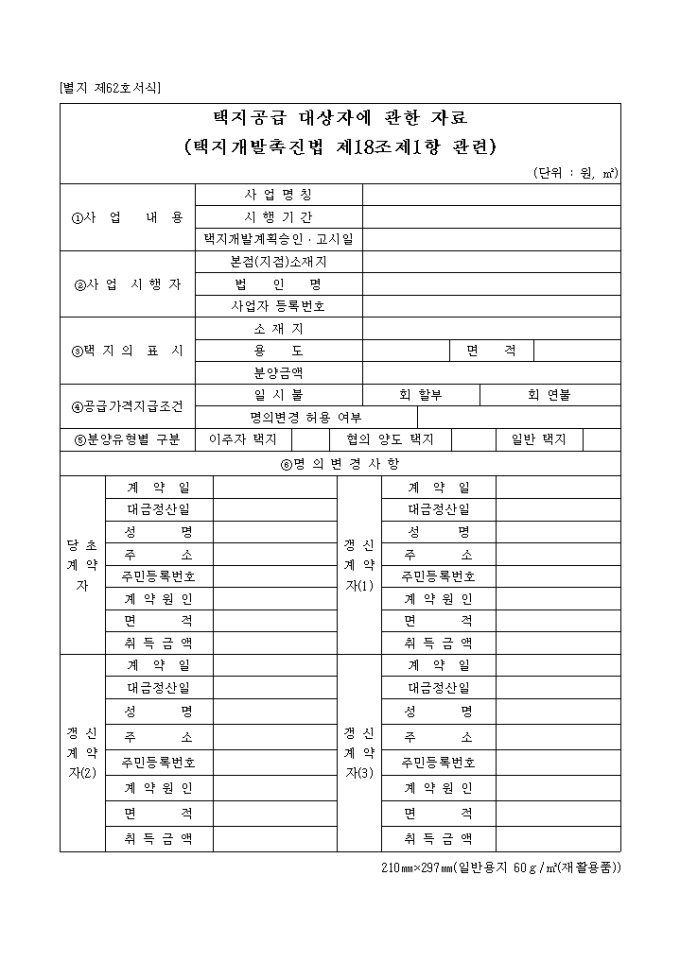 9,000원/월제62호서식은 택지 공급 대상자에 관한 자료로서 사업내용, 사업시행자, 택지의 표시, 공급가격지급조건 등을 기입합니다.