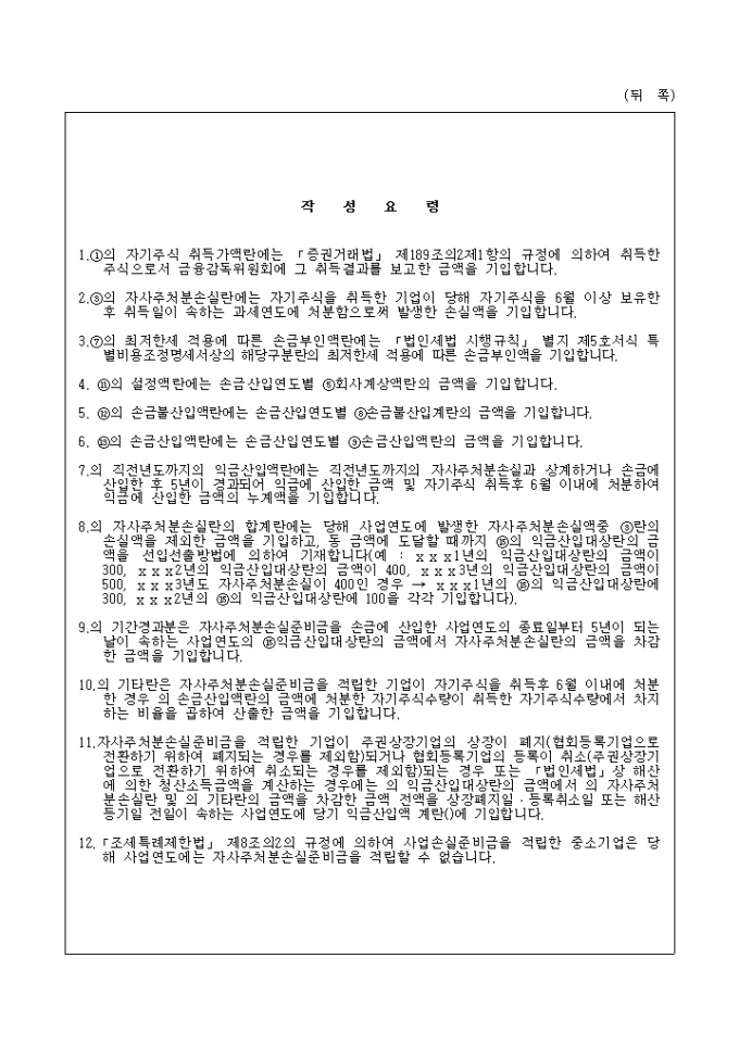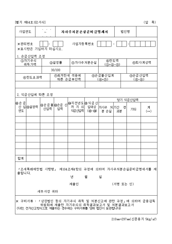 이 서식은 자사주식처분 손실 준비금 명세서입니다.