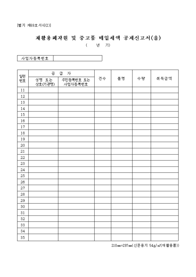 9,000원/월이 서식은 재활용 폐자원 및 중고품 매입 세액 공제 신고서로서 공급자의 인적사항, 건수, 품명, 수량 등을 기입합니다.
