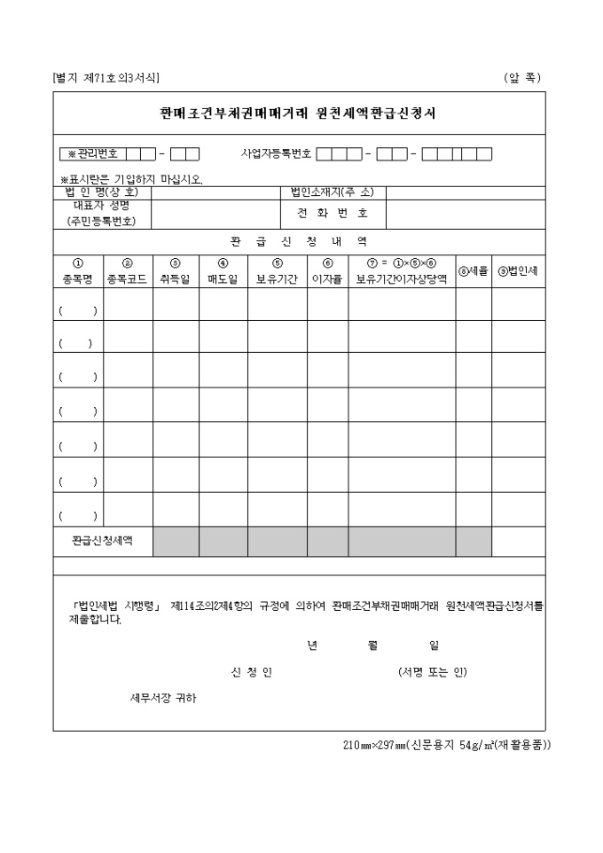 9,000원/월이 서식은 환매 조건부 채권 매매 거래 원천 세액 환급 신청서로서 신청자의 인적사항과 신청 내역을 기입합니다.