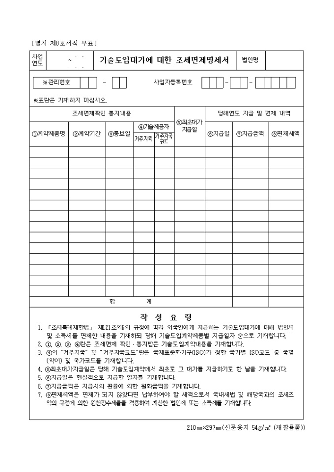 9,000원/월제8호서식은 기술 도입대가에 대한 조세면제명세서로서 조세면제확인 통지 내용, 당해연도 지급 면제 내용 등을 기입합니다.