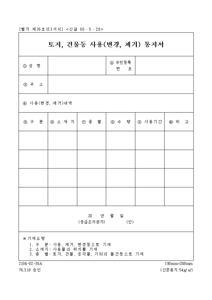 토지, 건물등사용(변경, 제거)통지서