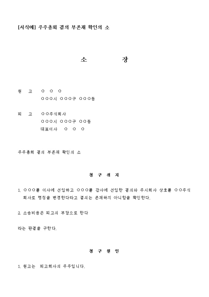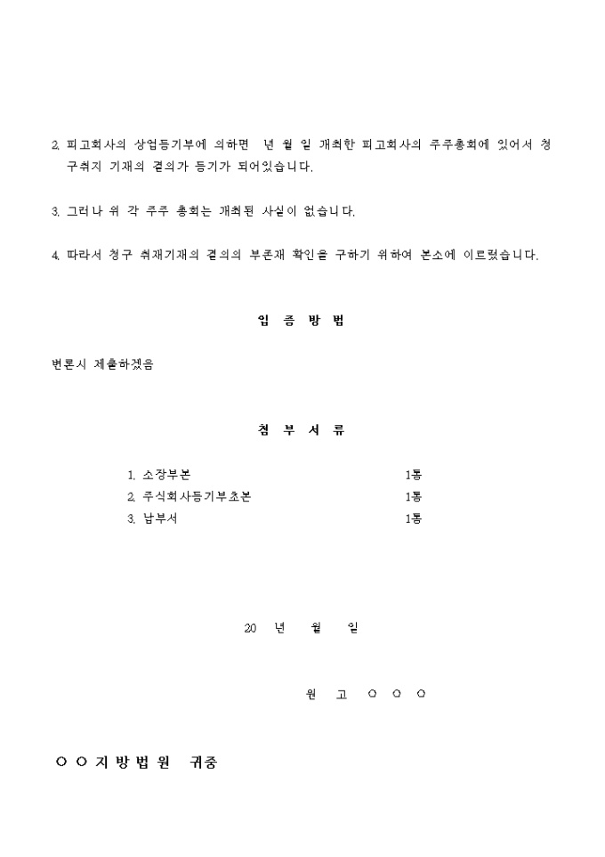 주주총회결의가 없었음을 구하는 소송을 할 때 사용하는 서식입니다.
