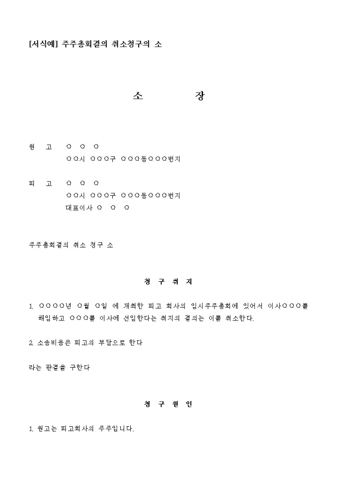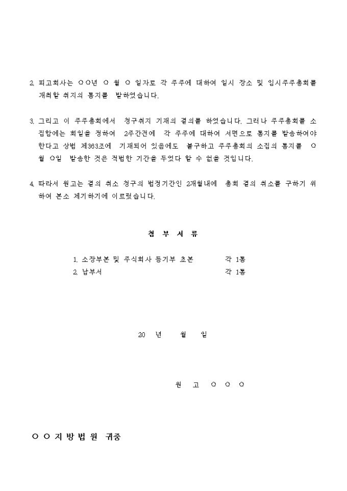 9,000원/월주주총회 소집기간의 부적법을 이유로 주주총회 결의 취소를 청구하는 소장입니다.