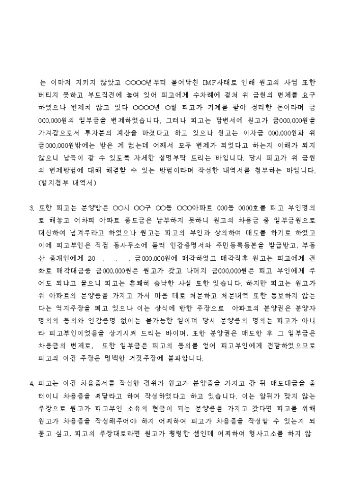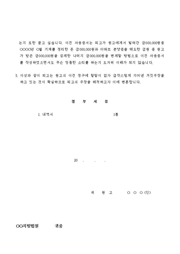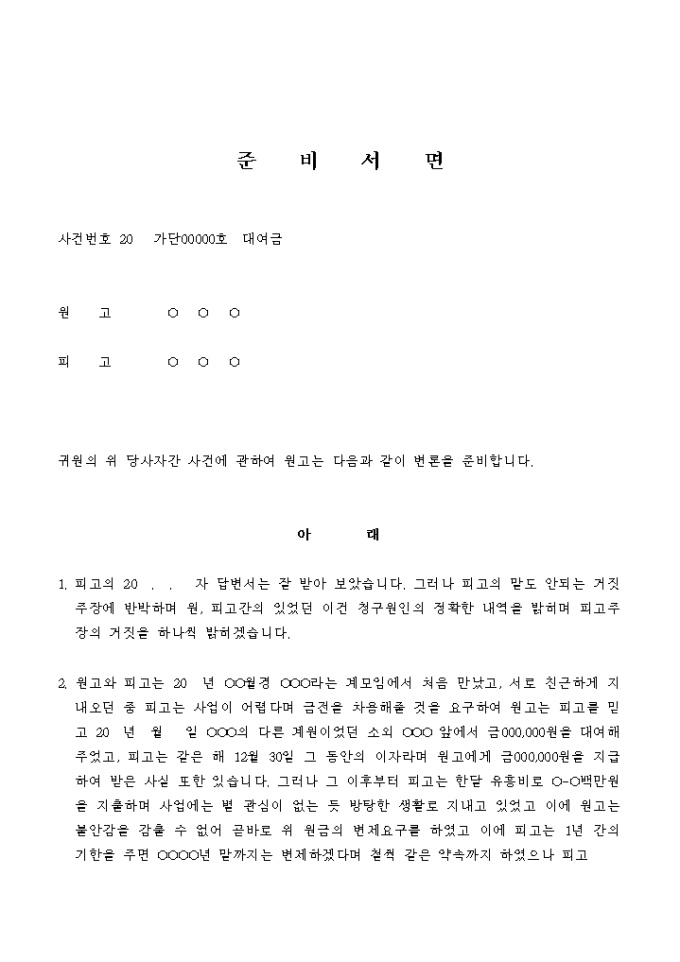 9,000원/월사업자금으로 금전을 대여한 경우에 그 금전의 변제를 청구하는 소송의 준비서면입니다.