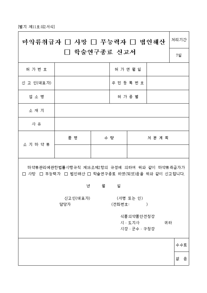 9,000원/월마약류관리에관한법률시행규칙 제16조제2항의 규정에 의하여 마약류취급자가 사망,무능력자,법인해산,학술연구종료를 신고하는 서식입니다