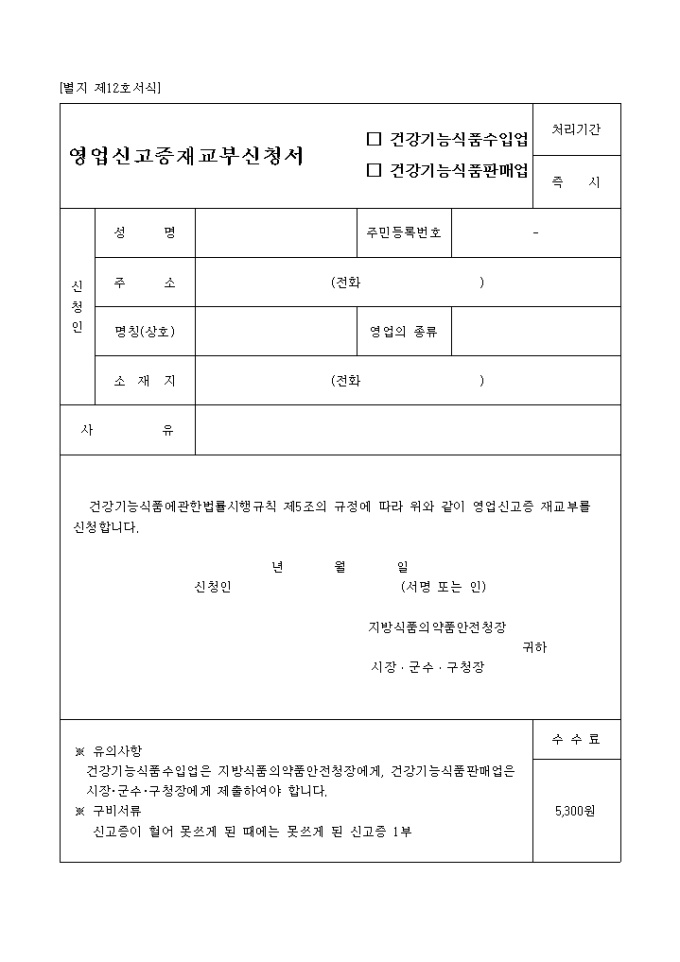 건강기능식품에관한법률시행규칙 제5조의 규정에 따라 영업신고증 재교부를 신청하는 서식입니다