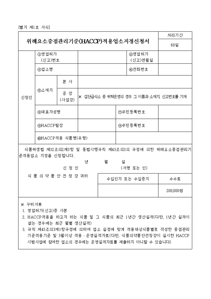 9,000원/월식품위생법 제32조의2제3항 및 동법시행규칙 제43조의3의 규정에 의한 위해요소중점관리기준적용업소 지정 신청시 필요한 서식입니다.