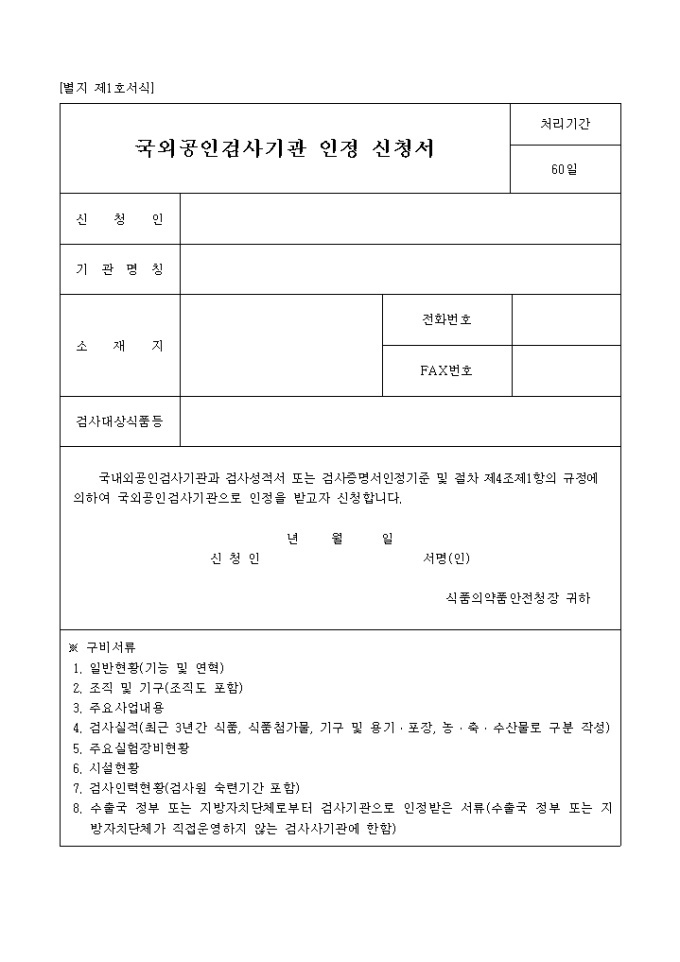 9,000원/월국내외공인검사기관과 검사성적서 또는 검사증명서인정기준 및 절차 제4조제1항의 규정에 의하여 국외공인검사기관으로 인정 신청시 필요한 서식입니다.