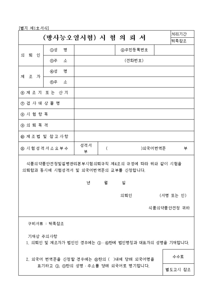9,000원/월식품의약품안전청및질병관리본부시험의뢰규칙 제4조의 규정에 따라 방사능 시험을 의뢰함과 동시에 시험성적서 및 외국어번역문의 교부 신청시 필요한 서식 입니다.