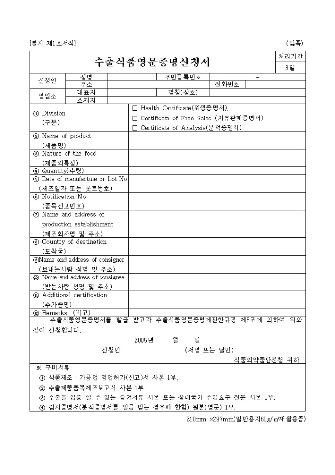 9,000원/월수출식품영문증명에관한규정 제5조에 의하여 수출식품영문증명서 발급 신청시 필요한 서식입니다.