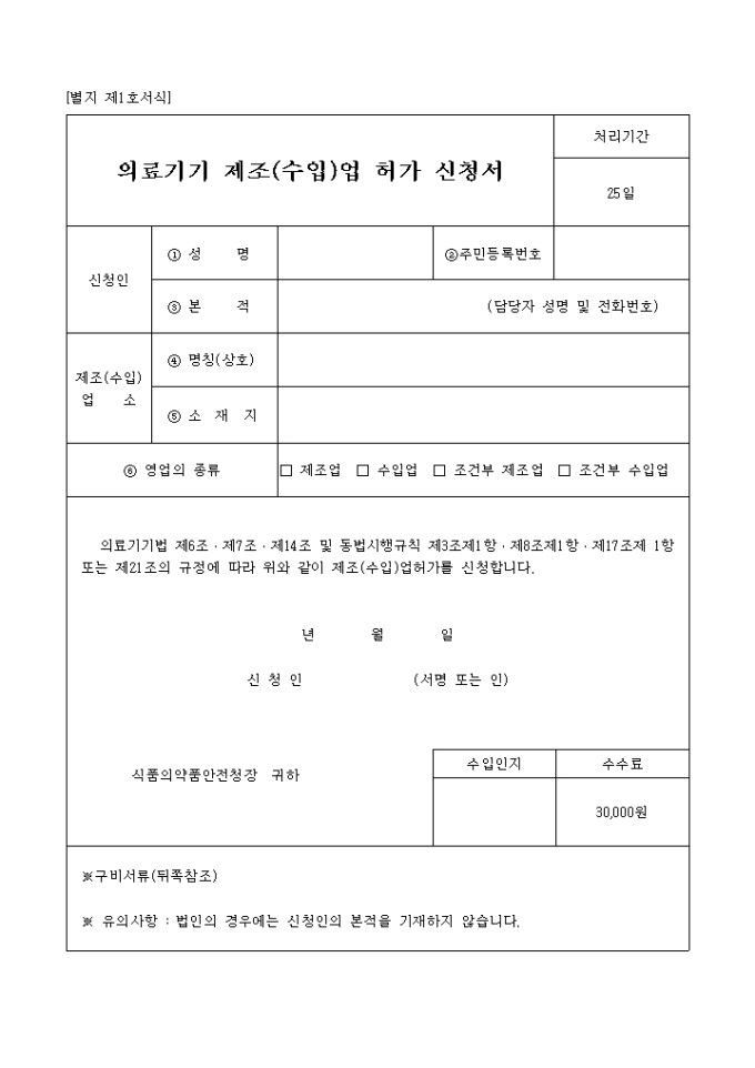의료기기법 제6조,제7조,제14조 및 동법시행규칙 제3조제1항,제8조제1항,제17조제 1항 또는 제21조의 규정에 따라 제조(수입)업허가 신청시 필요한 서식입니다.