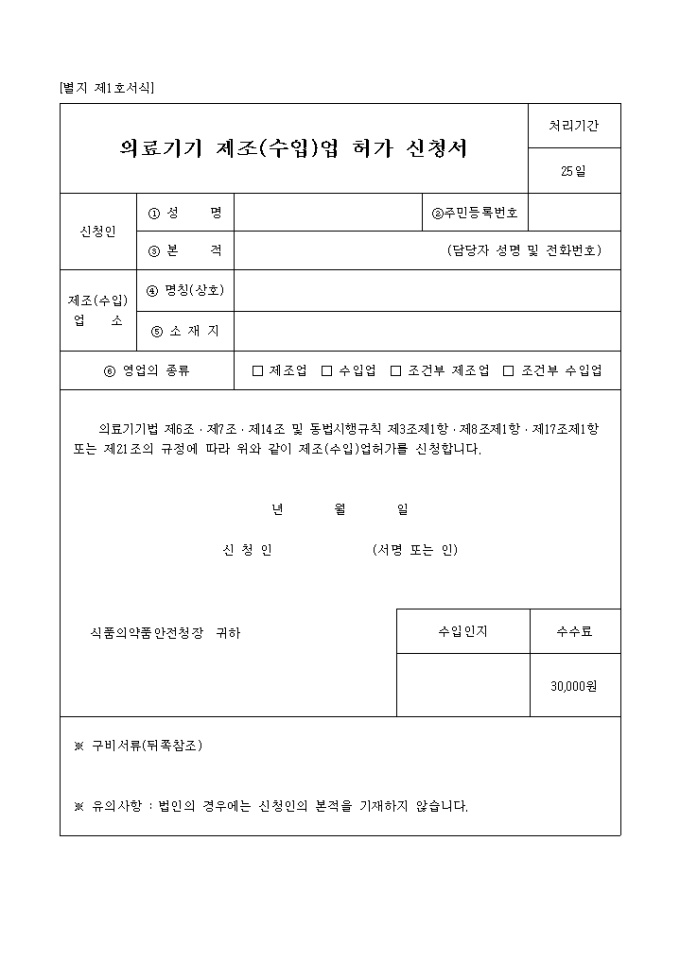9,000원/월의료기기법 제6조,제7조,제14조 및 동법시행규칙 제3조제1항,제8조제1항,제17조제1항 또는 제21조의 규정에 따라 제조업허가 신청시 필요한 서식입니다.