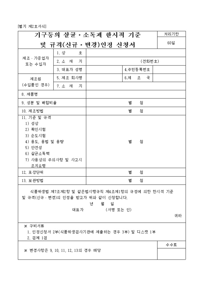 9,000원/월식품위생법 제7조제2항 및 같은법시행규칙 제4조 제1항의 규정에 의한 기구등의 살균, 소독제 한시적 기준 및 규격(신규, 변경)의 인정 신청에 필요한 서식입니다.