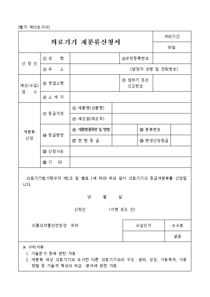 의료기기법시행규칙 제2조 및 별표1에 따른 의료기기의 등급재분류 신청 서식입니다.