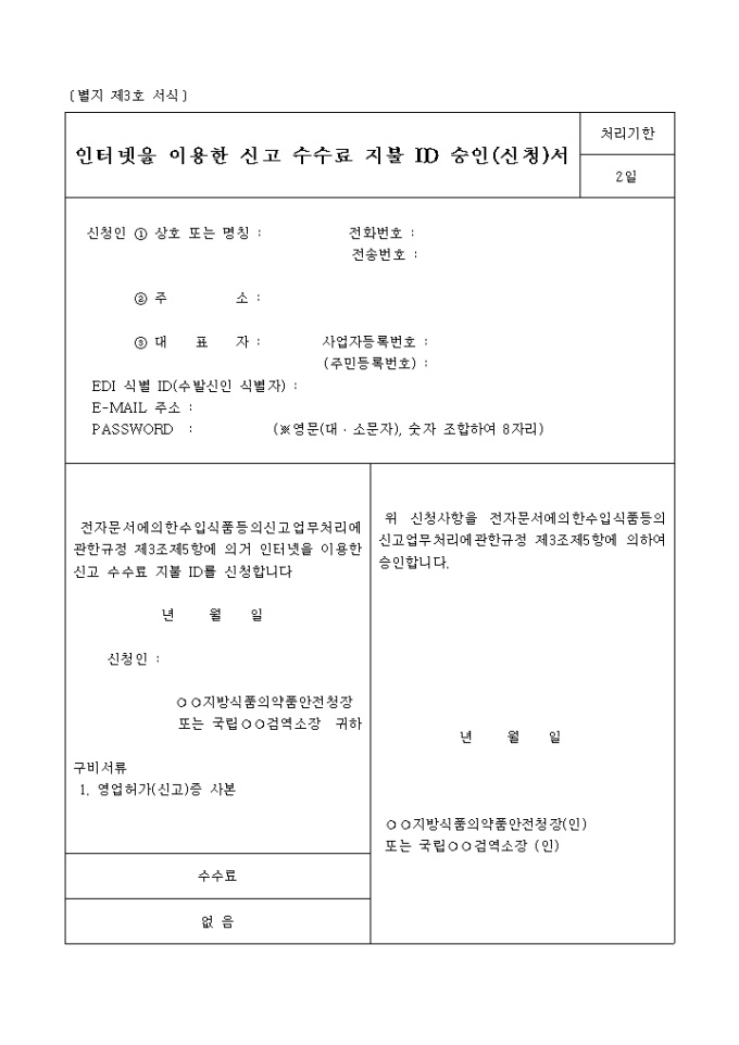 9,000원/월전자문서에의한수입식품등의신고업무처리에관한규정 제3조제5항에 의거한 인터넷을 이용한 신고 수수료 지불ID 신청서식입니다.