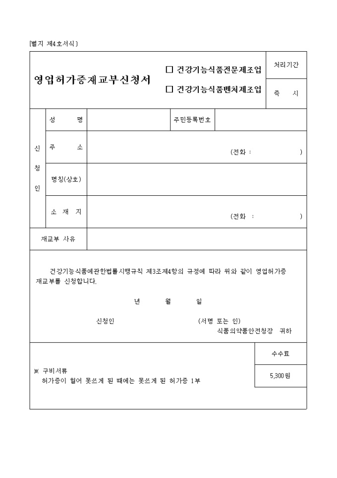 9,000원/월건강기능식품에관한법률시행규칙 제3조제4항의 규정에 의거한 영업허가증 재교부 신청 서식입니다.
