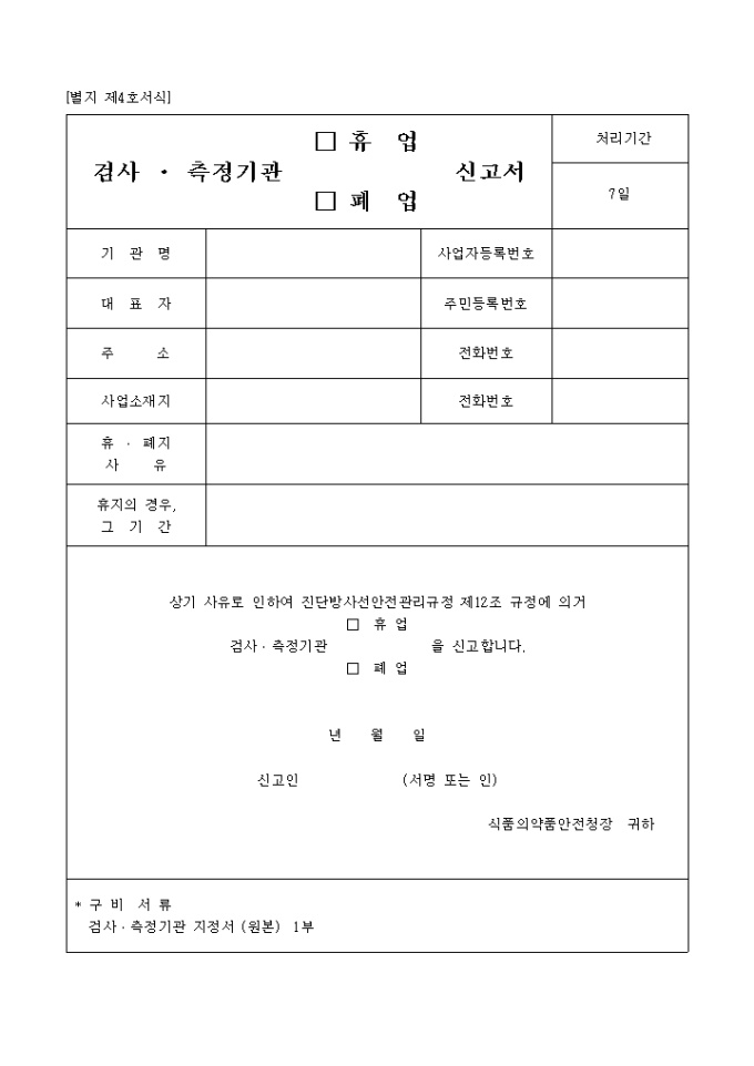 9,000원/월진단방사선안전관리규정 제12조 규정에 의거한 검사·측정기관 휴업, 폐업 신고 서식입니다.